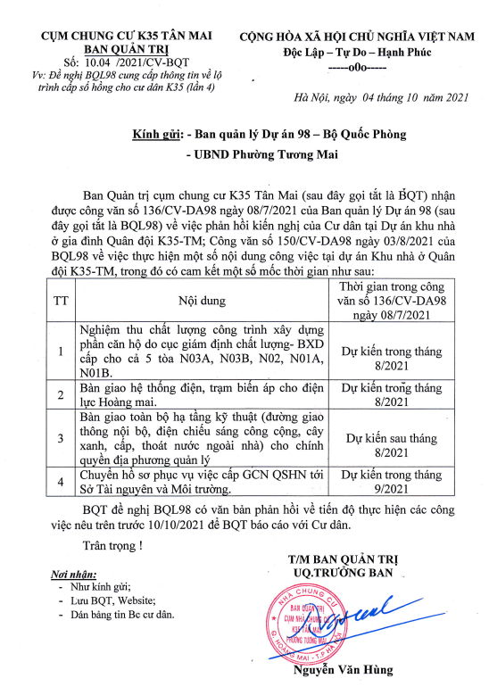 Ngày 04/10/2021, Ban Quản trị cụm nhà chung cư K35 Tân Mai đã có công văn số 10.04/2021/CV-BQT về việc: Đề nghị BQL98 cung cấp thông tin về lộ trình cấp sổ hồng cho cư dân K35 (lần 4).