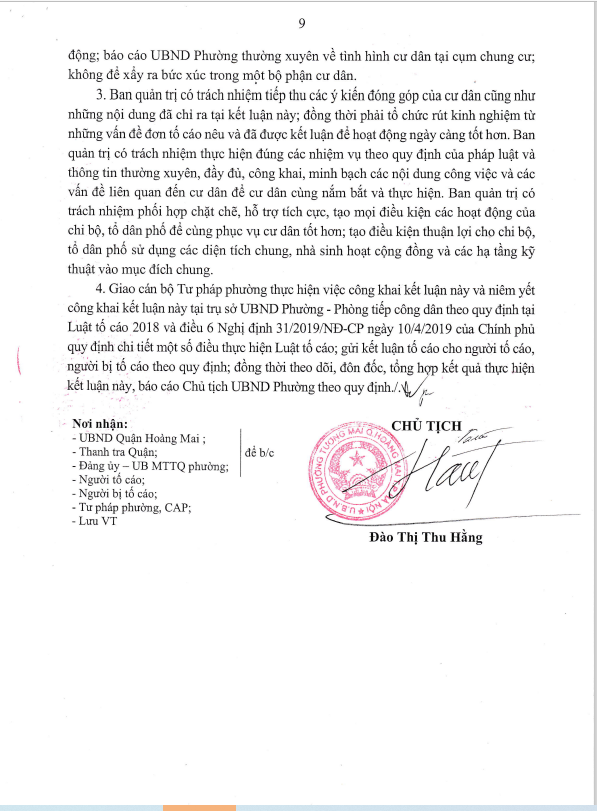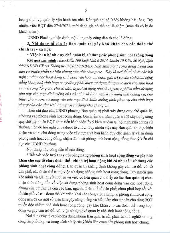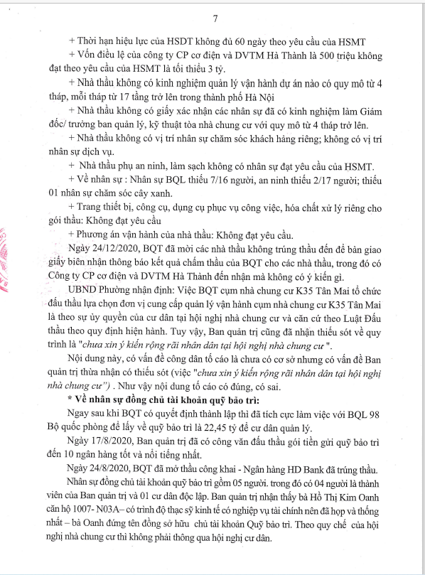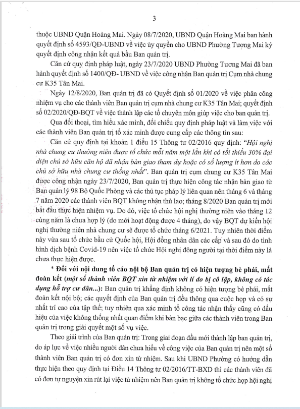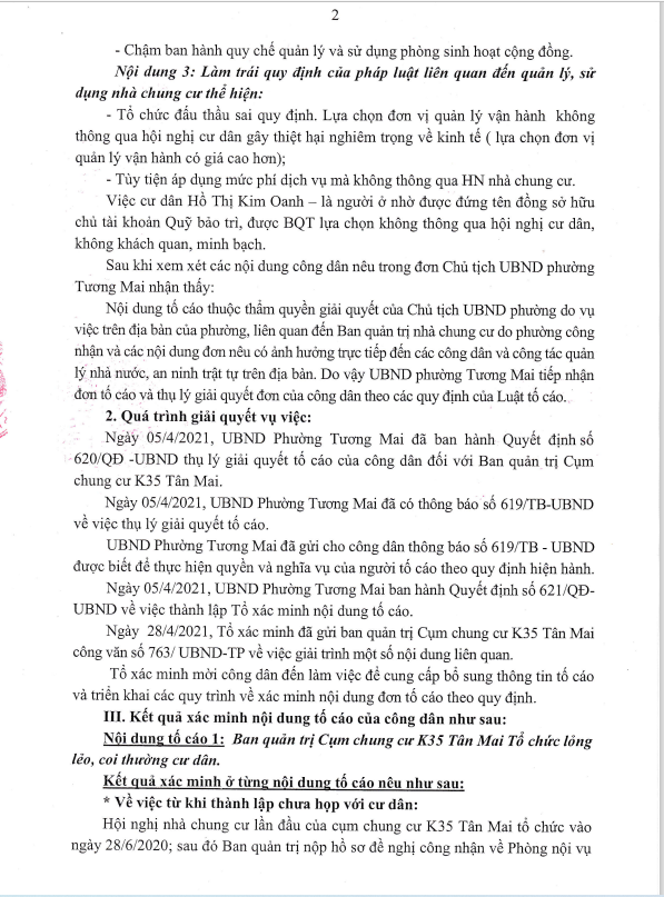 Ngày 26/10/2021, UBND phường Tương Mai ra kết luận số 2772/KL-UBND kết luận về nội dung tố cáo đối với BQT cụm nhà chung cư K35 Tân Mai.