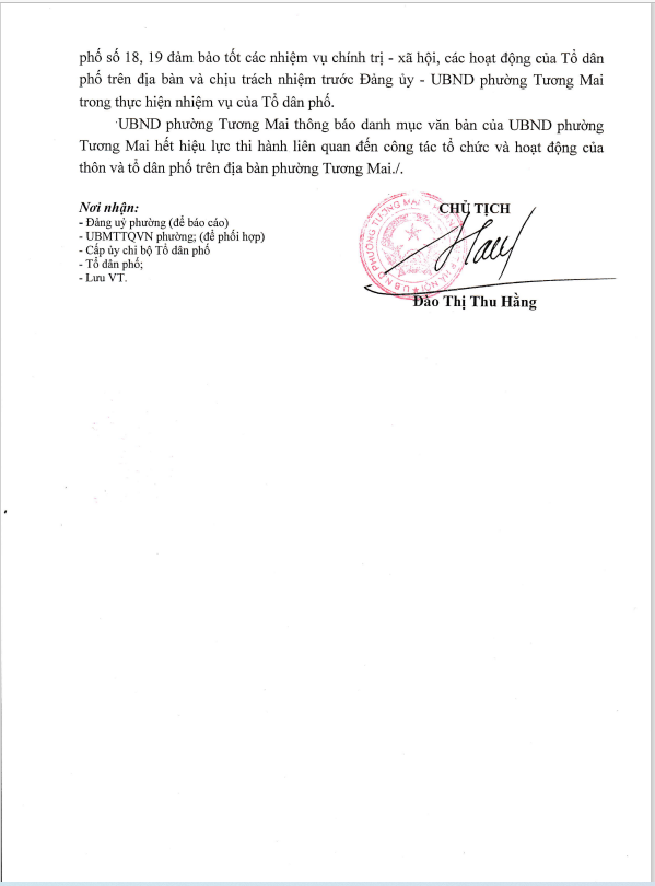 Ngày 27/10/2021, UBND phường Tương Mai đã ra công văn số:2775/UBND-VP về việc công bố danh mục văn bản của UBND phường Tương Mai hết hiệu lực thi hành