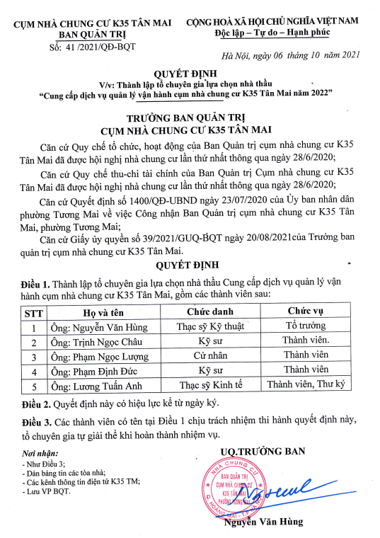 Thành lập tổ chuyên gia lựa chọn nhà thầu “Cung cấp dịch vụ quản lý vận hành cụm nhà chung cư K35 Tân Mai năm 2022”