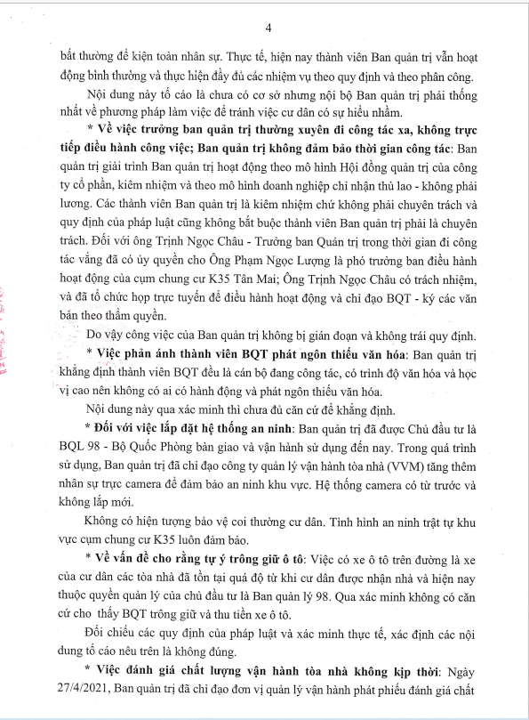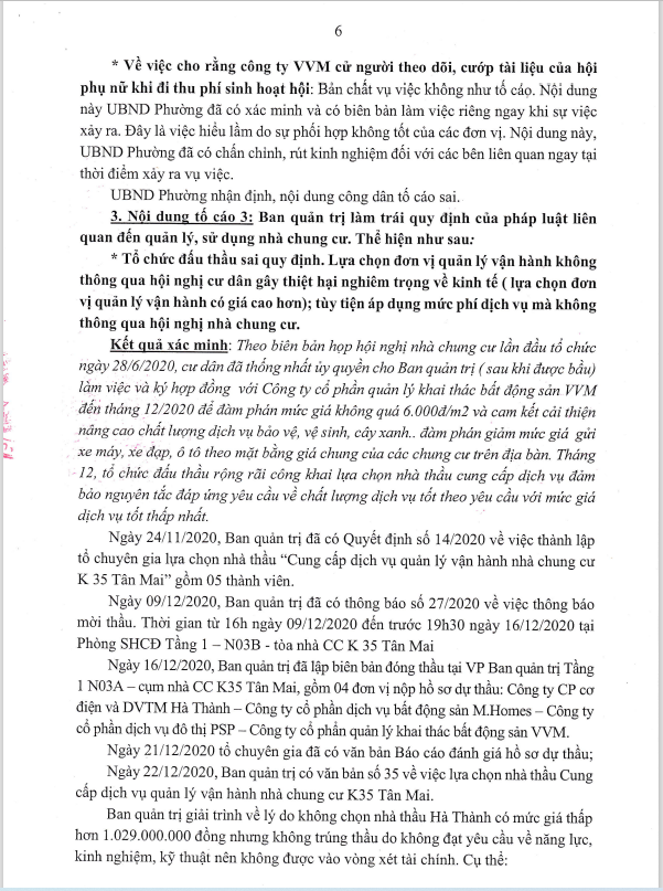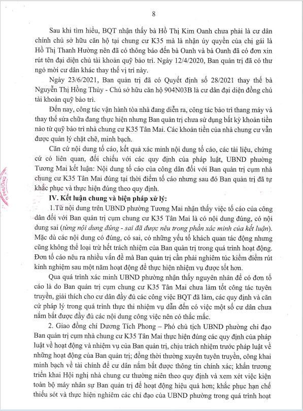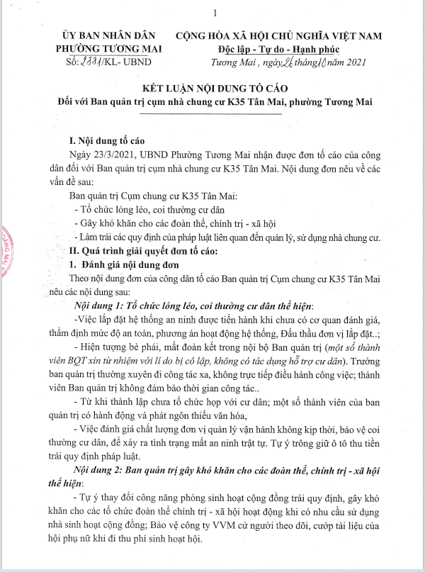 Ngày 26/10/2021, UBND phường Tương Mai ra kết luận số 2772/KL-UBND kết luận về nội dung tố cáo đối với BQT cụm nhà chung cư K35 Tân Mai.