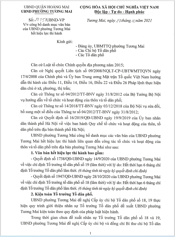 Ngày 27/10/2021, UBND phường Tương Mai đã ra công văn số:2775/UBND-VP về việc công bố danh mục văn bản của UBND phường Tương Mai hết hiệu lực thi hành